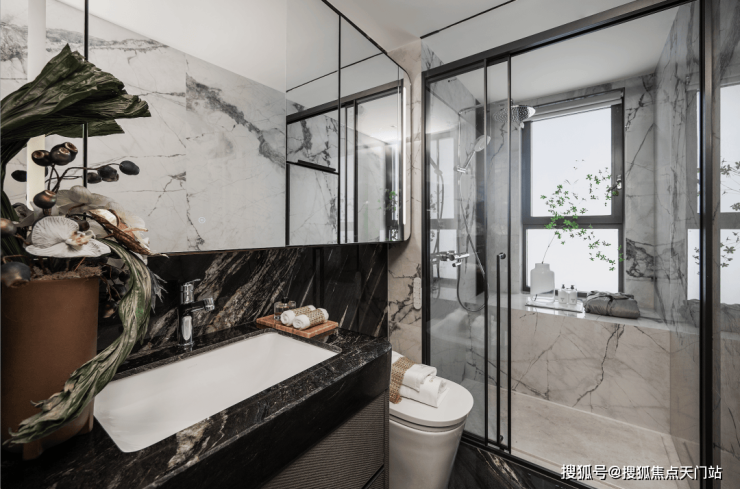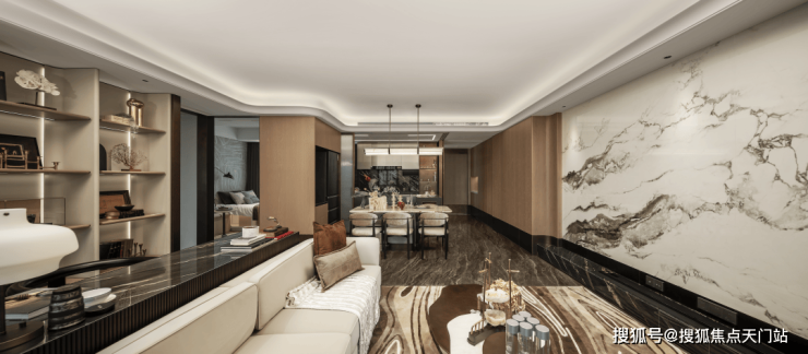 比如主卧飘窗底部以玻璃全包裹工艺,实现“悬浮美学”;电梯厅墙面采用莫奈奢石拼花,搭配金属格栅与线性灯带,形成“光影画廊”效果......