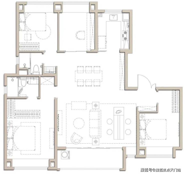 建面约100㎡是个典型的飞机户型,全明户型南北通透,独立玄关实用美观,几乎无过道浪费,延伸了空间的尺度。