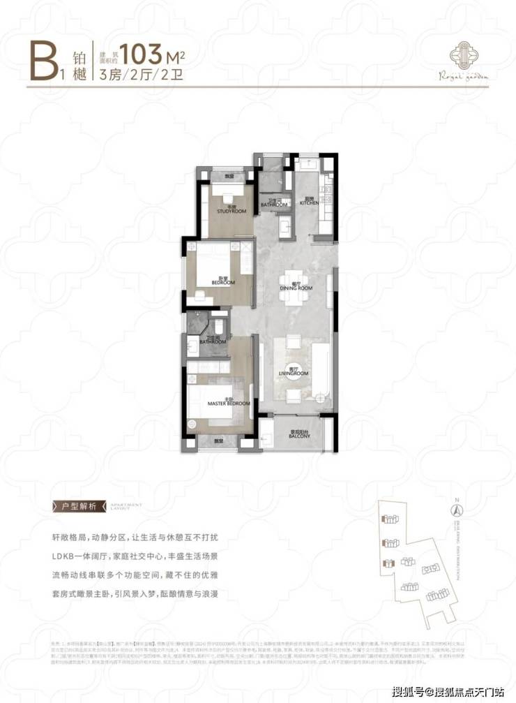适合三口之家或年轻家庭居住的动静分区户型,厨房、餐厅、客厅及阳台一体化设计,动静完全分区设计,相当人性化!主卧套房设计满满尊崇感;次卫三分离干湿分区设计,考量十分贴心!
