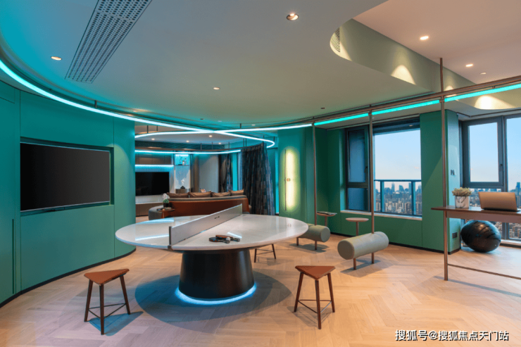 还有吧台、休闲洽谈区、共享会议和健身等功能区,是一个适合交友、会客、休憩、工作、读书、赏景的多功能空间.处处可见的时尚元素,符合当下年轻一代喜好。