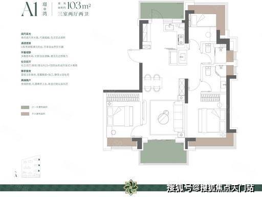 建面约 103㎡三房两厅两卫:经典刚需改善户型,格局方正,动静分区清晰。采用三开间朝南设计,南向面宽超 10 米,客厅连接阔景阳台,主卧为套房设计,配备独立卫生间与 270° 全景飘窗,次卧与儿童房尺度适宜,U 型明厨操作动线流畅,空间利用率极高。楼栋为两梯两户设计,多数房源朝南,兼顾采光与居住实用性。