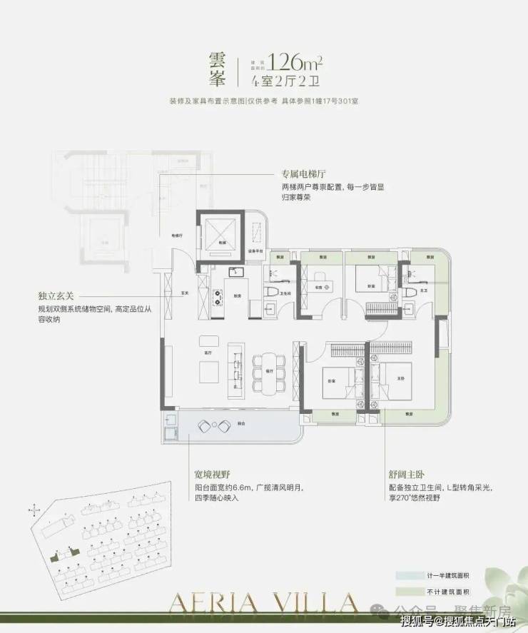 同时,这个户型做两面宽设计,使得能拥有一个超大面宽的横厅,并且还是南向270度转角采光。