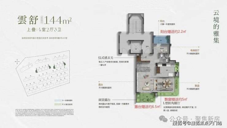 约144㎡上叠,入户独立梯厅,带来更好的功能利用和私密性。