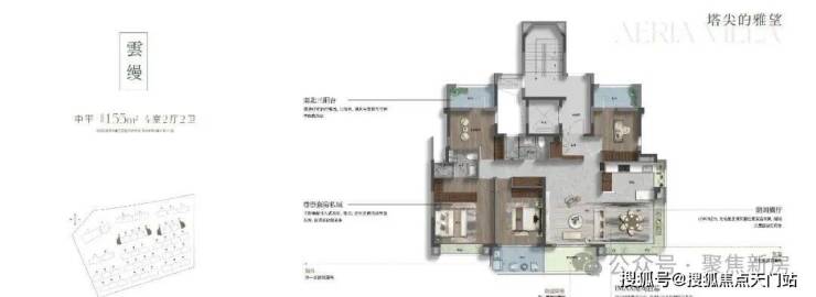 约168㎡上叠;这个户型同样独立电梯厅,但是三面宽设计,南向三阳台空间并列。