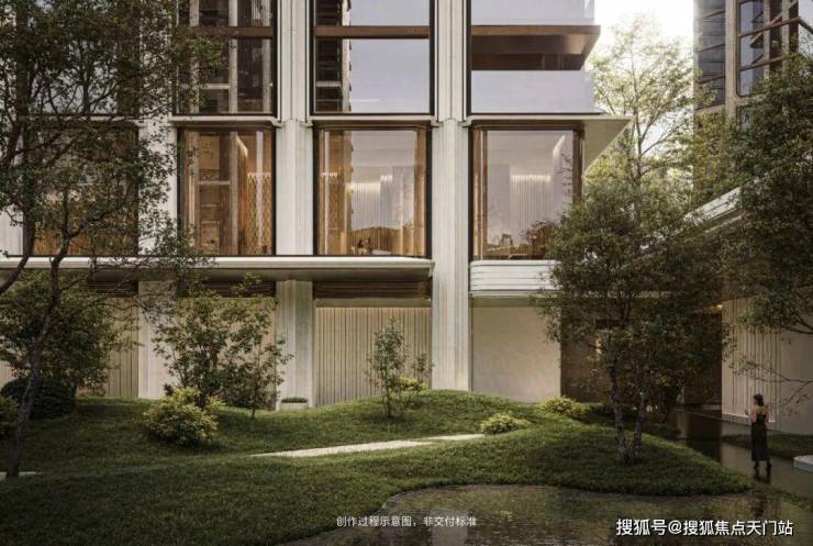 “回归之境”以3500㎡下沉水苑为核心,汇聚会客、泳池、茶室等多功能空间,形成仪式感十足的社区舞台。