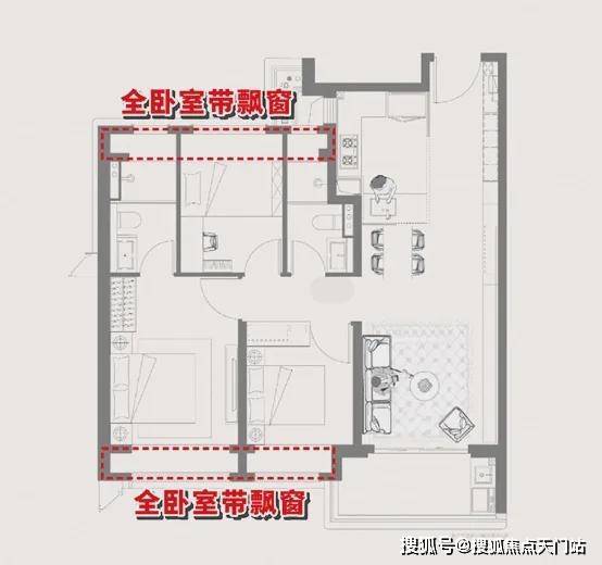 南向双套房设计,兼顾私密与便利,给予三代同堂家庭,最大的尊重。全飘窗设计,不仅可利用空间高,奢贵气质尽显。