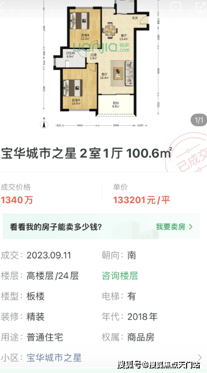 但是,现在在二手房市场,宝华城市之星,一枝独秀,某绿皮网站显示,项目在今年9月11日就成交了一套100㎡房源,成交单价高达13.3万!