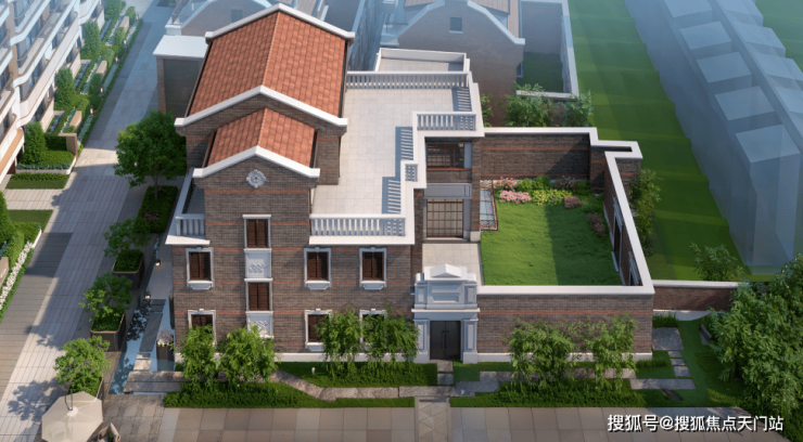 同时,建筑师还利用车行主入口的空间,结合水景、景墙和绿化打造出别具风格的开放式景观节点,并在风貌保护区的巷弄内设置端头对景,宅间花园等。