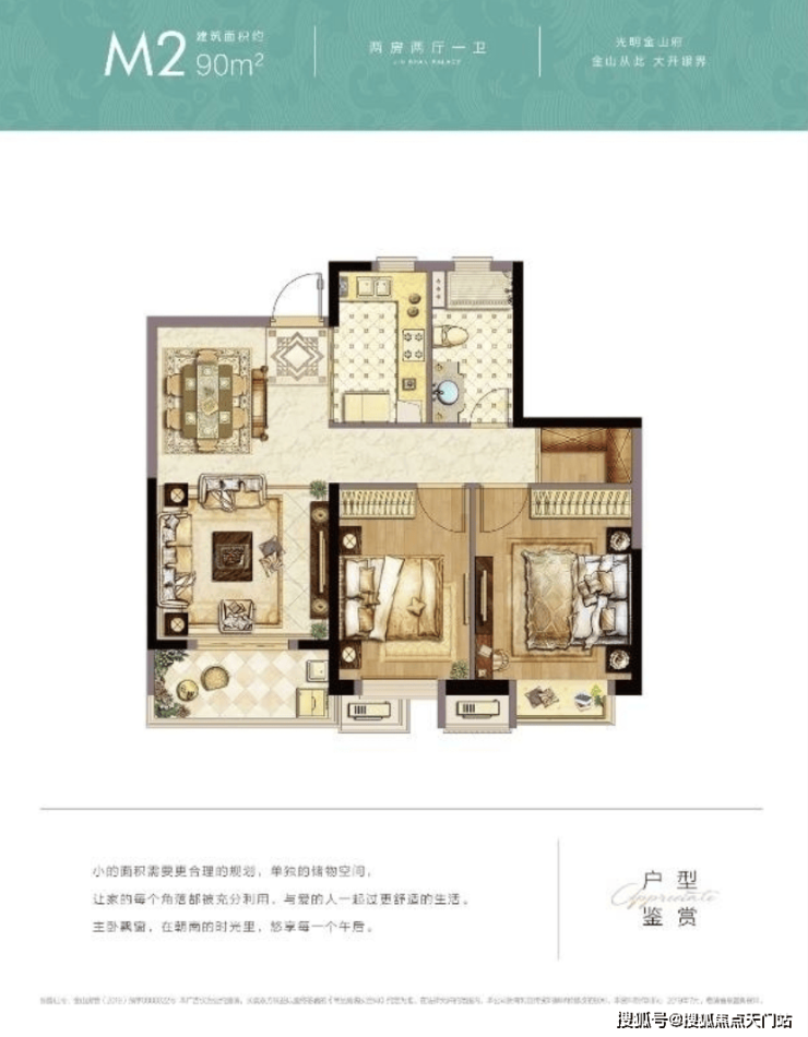 建面约90㎡2房2厅1卫,两间卧室朝南,舒适尺度搭配观景阳台,干湿分离的独立卫浴。