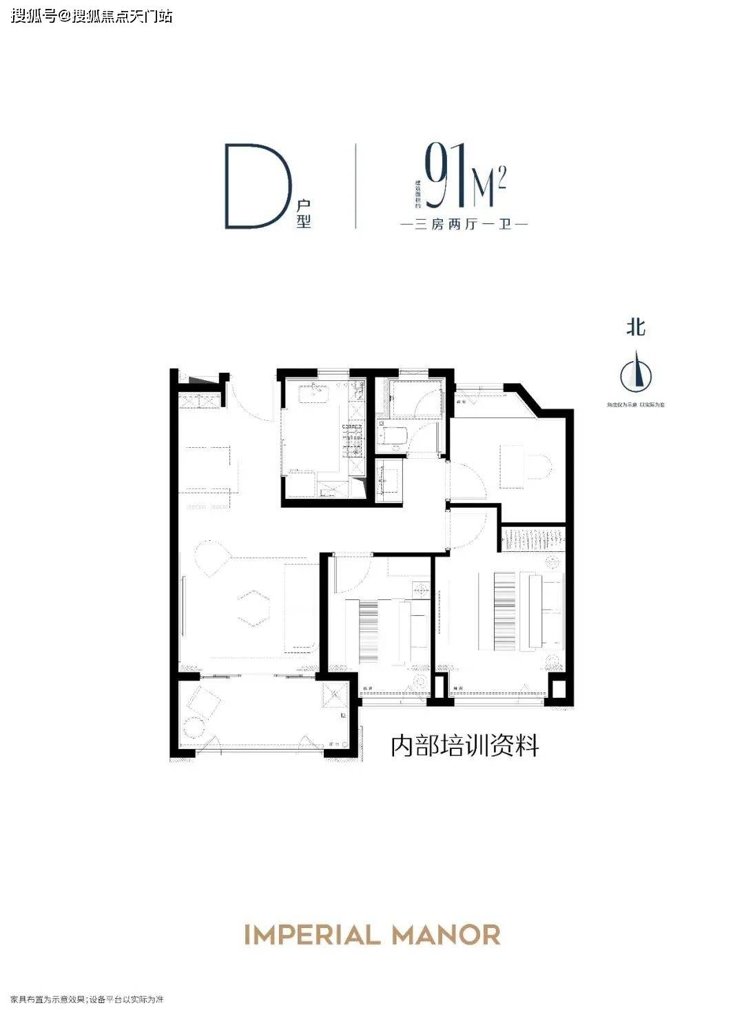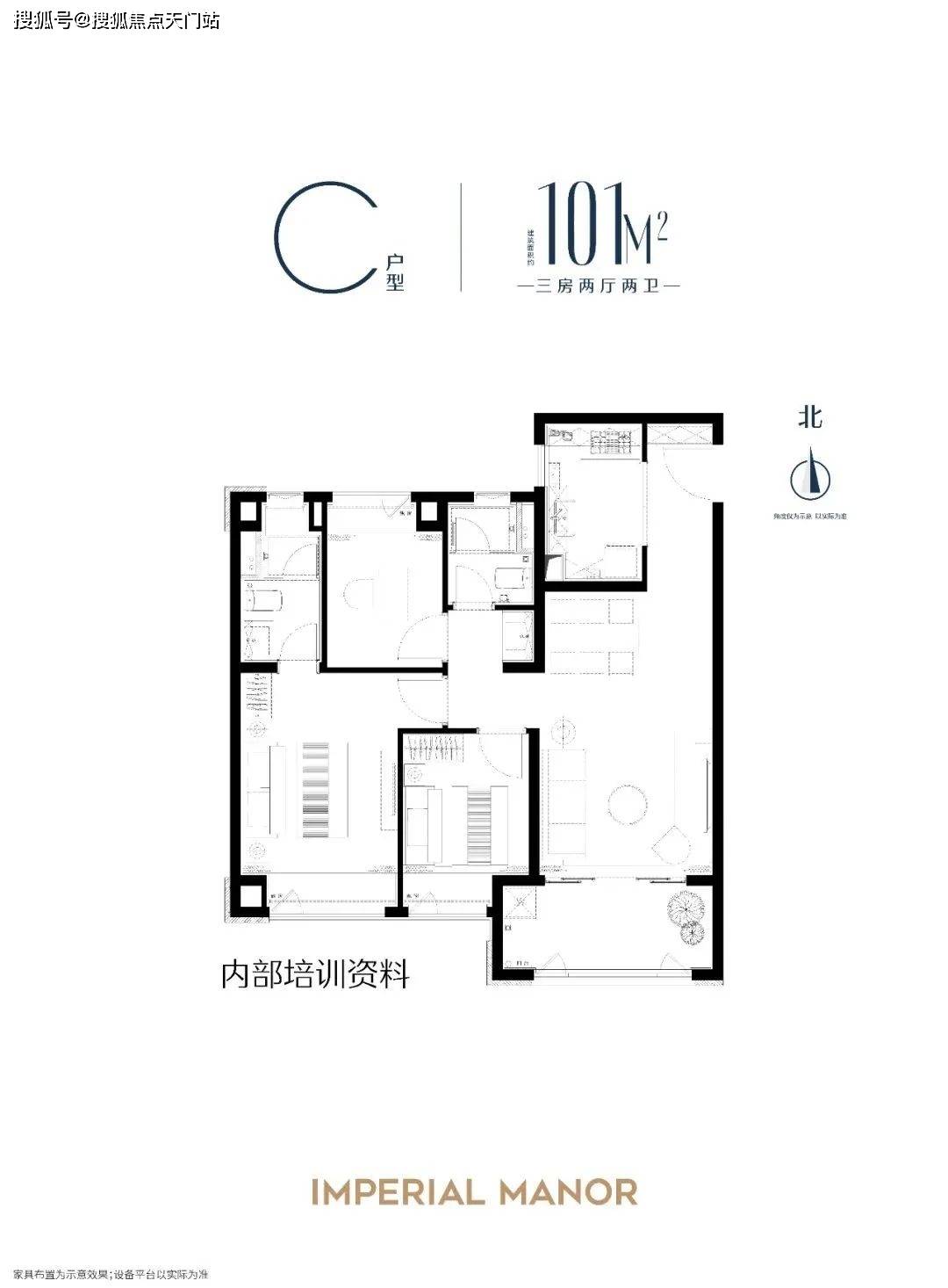 我们先来看户型设计,以建筑面积约101㎡三房两厅两卫的样板间为例。
