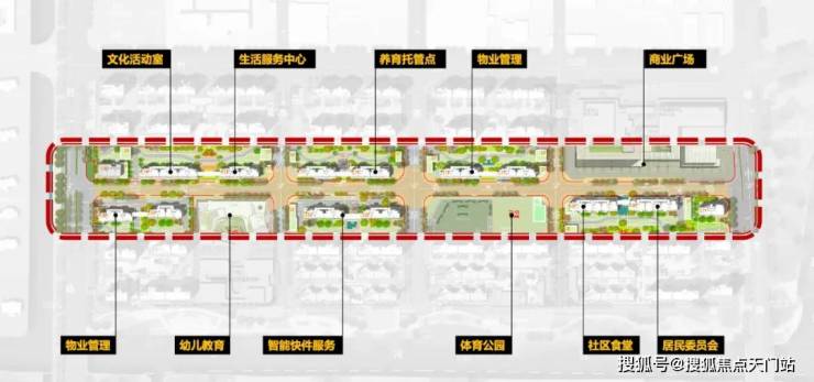 一轴:幼儿园、体育公园、快递驿站、文化活动空间等