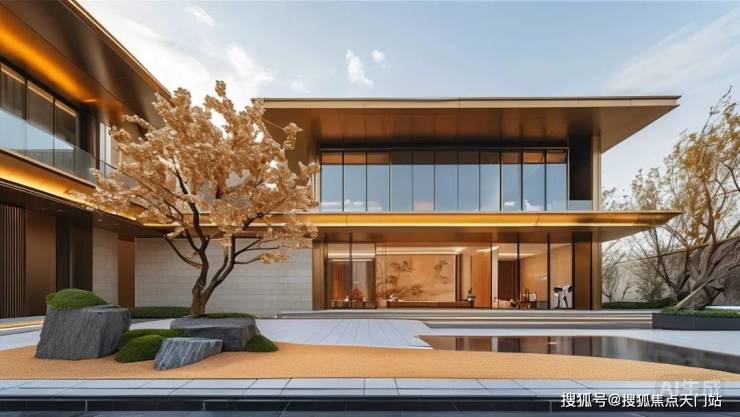 在1:1复刻的叠墅庭院中,触摸香槟金铝板与天然石墙的肌理对话;