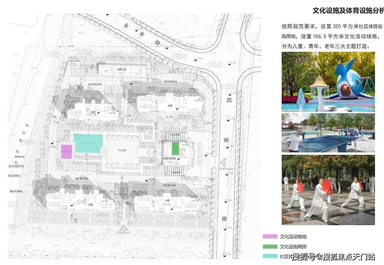 320平方米社区体育设施用地,106.5平方米文化活动场地,分为儿童、青年、老年三大主题打造