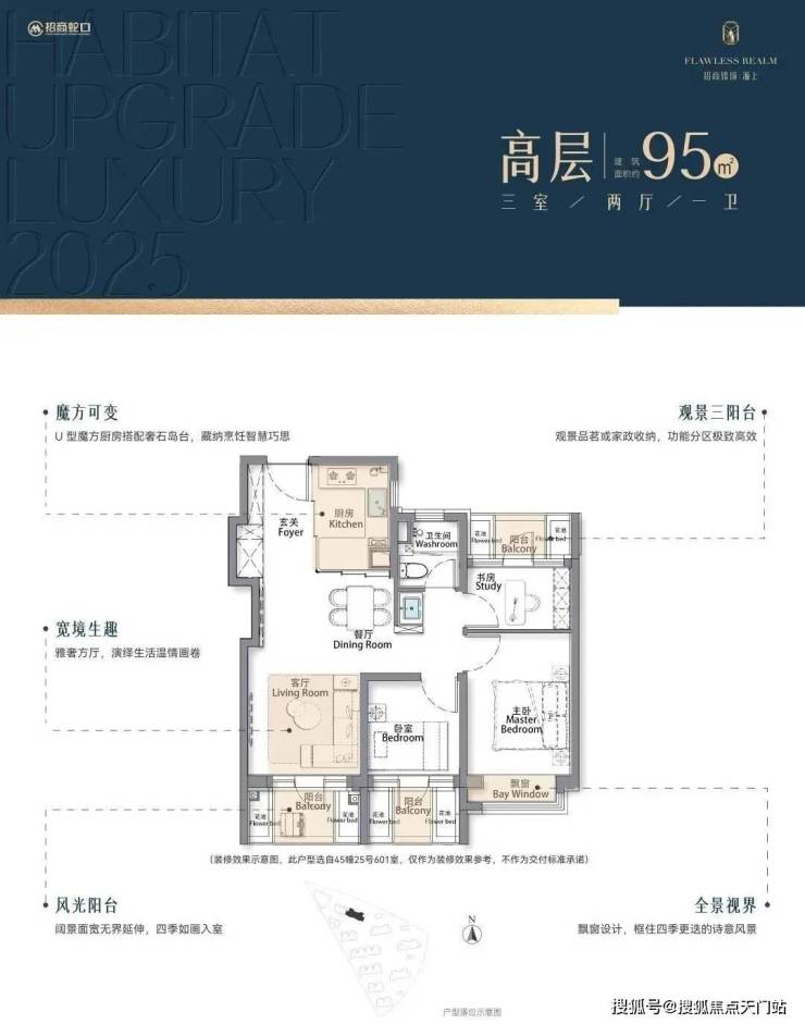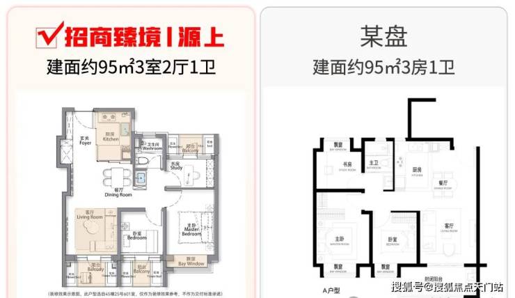 但招商臻境源上的建面约95㎡3房却截然不同,TA凭借着3阳台的设计,给到客户一个真正的三房户型: