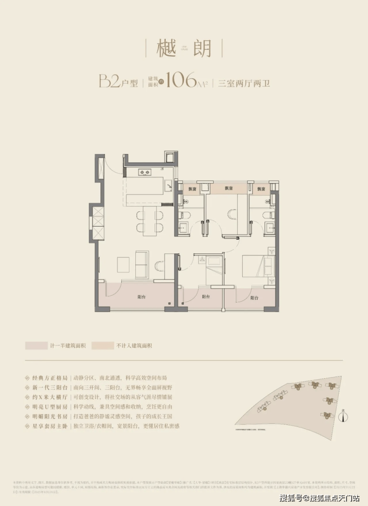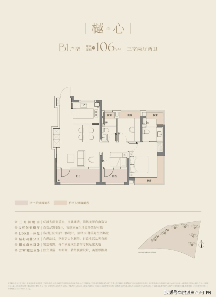建筑面积约106㎡户型,更是以宽尺大横厅和270°的转角飘窗赚足了眼球,阳光与清风自由流淌,居住舒适度全面提升。LDKB一体化设计,在餐厨区布局万能中岛台,打破了厨房与餐厅的界限,延伸烹饪空间,增加收纳空间,更将社交功能融入其中,重塑中国人的情感场域。