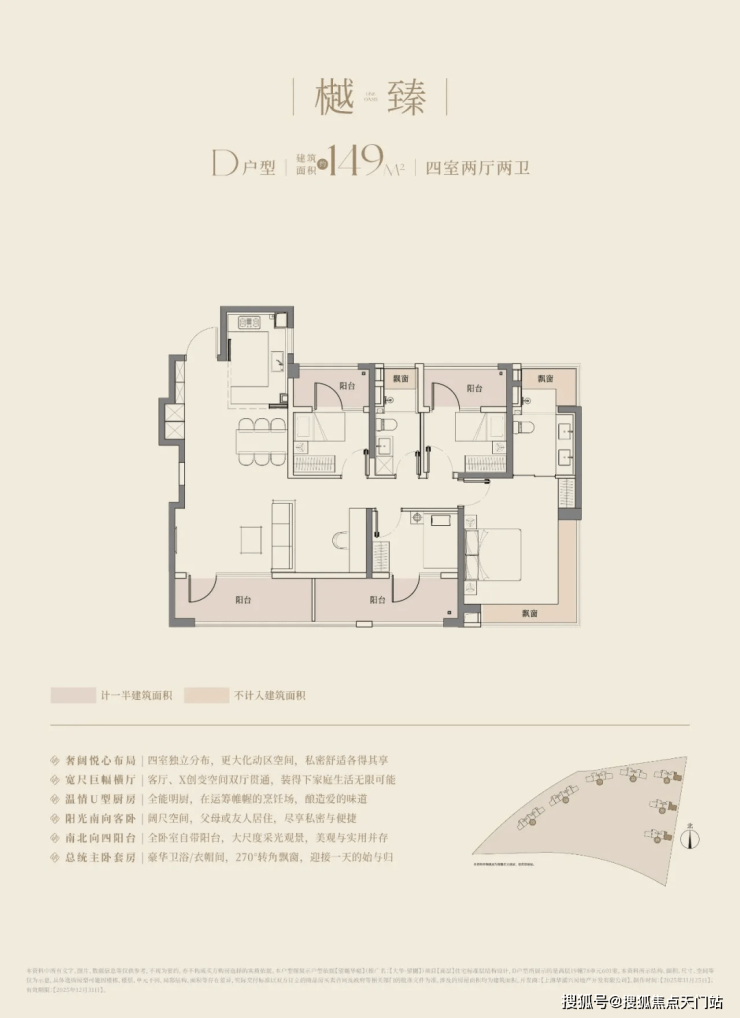 以建面约148㎡户型为例,四阳台+双270°转角飘窗设计,实得面积多出约15㎡,相当于“白赚一间书房”。