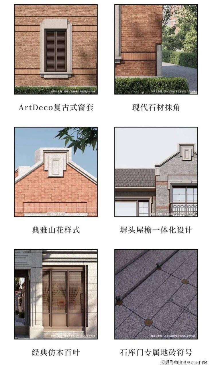 深入看细节,你会发现项目高颜值的6大新复古元素。包括 Artdeco复古式窗套、现代石材抹角、典雅山花样式、墀头屋檐一体化设计、经典仿木百叶、石库门专属地砖符号等,用先锋表达回应在地文化。