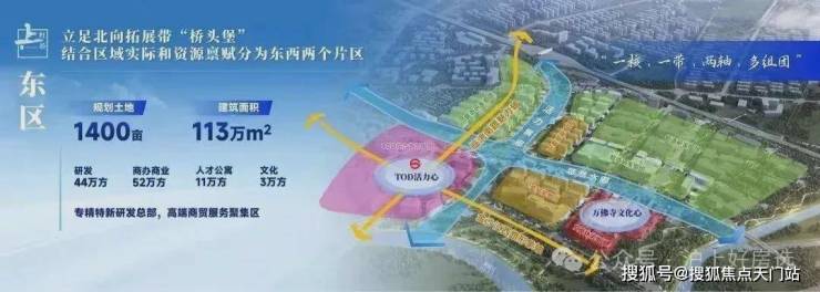 东区规划约1400亩土地,整体架构为“一核、一带、两轴、多组团”,聚焦商务研发功能。