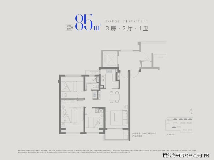 建面约85㎡3房1卫,做到三开间朝南+全卧室带飘窗+卫生间干湿分离+动静分离,非常紧凑的小3房。