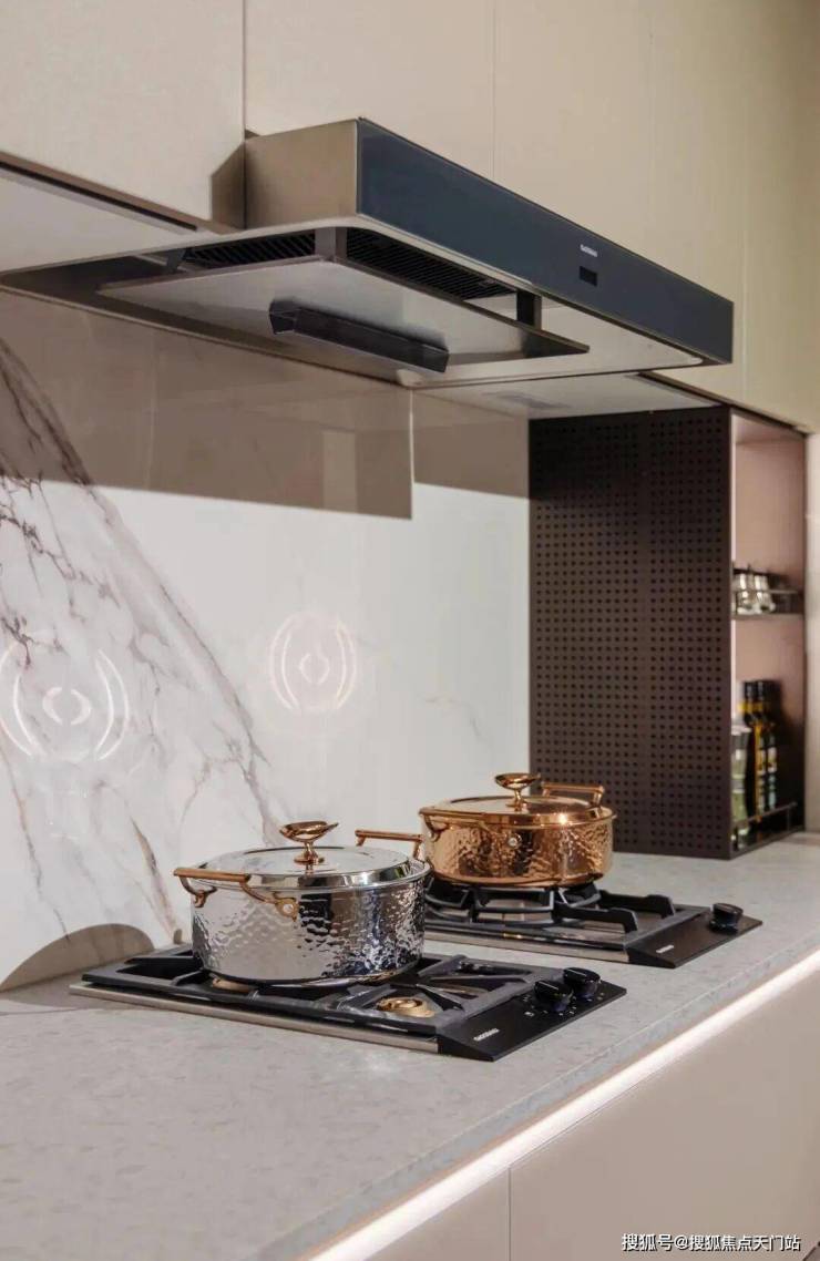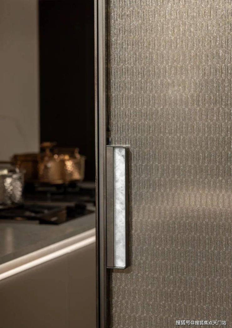 厨房空间中,竹纹夹丝玻璃推拉门与内嵌石材的把手展现极致工艺,卡拉拉金大岩板台面与威乃达玻璃烤漆门板相映成辉,配备的中西厨嘉格纳十件套科学布局,其中西厨柜体配备的蒸箱、烤箱、咖啡机、暖碟机、酒柜五件套满足全方位烹饪需求。