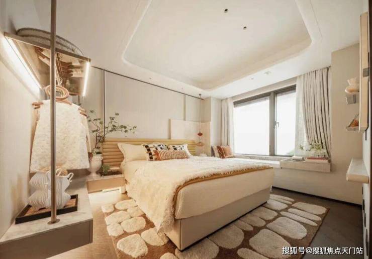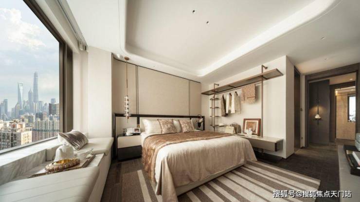 主卧套房内,皮革背景墙内嵌非遗云纹立体墙布,书香门第木地板以回形纹铺就,顶级爵士白飘窗将室内外景致完美融合。此外,六扇门步入式衣帽间,搭配夹丝玻璃门,让空间有序从容