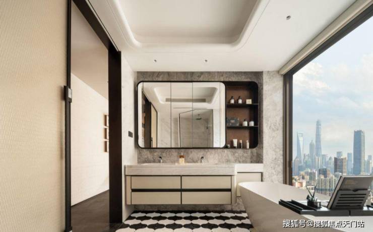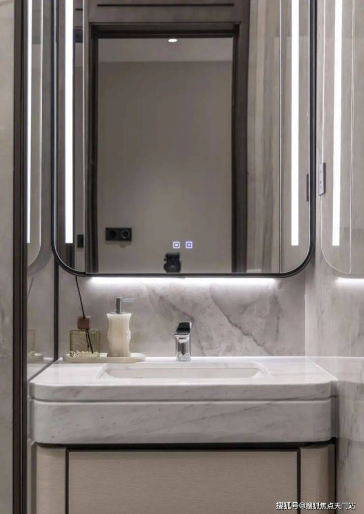主卧套卫,鱼肚灰大理石与博雅白台面的精工对拼,台面石材的精雕工艺,防水防潮皮革与香奈儿灰、星耀灰的拼花设计,配以南斯拉夫白淋浴间墙面,打造艺术奢境