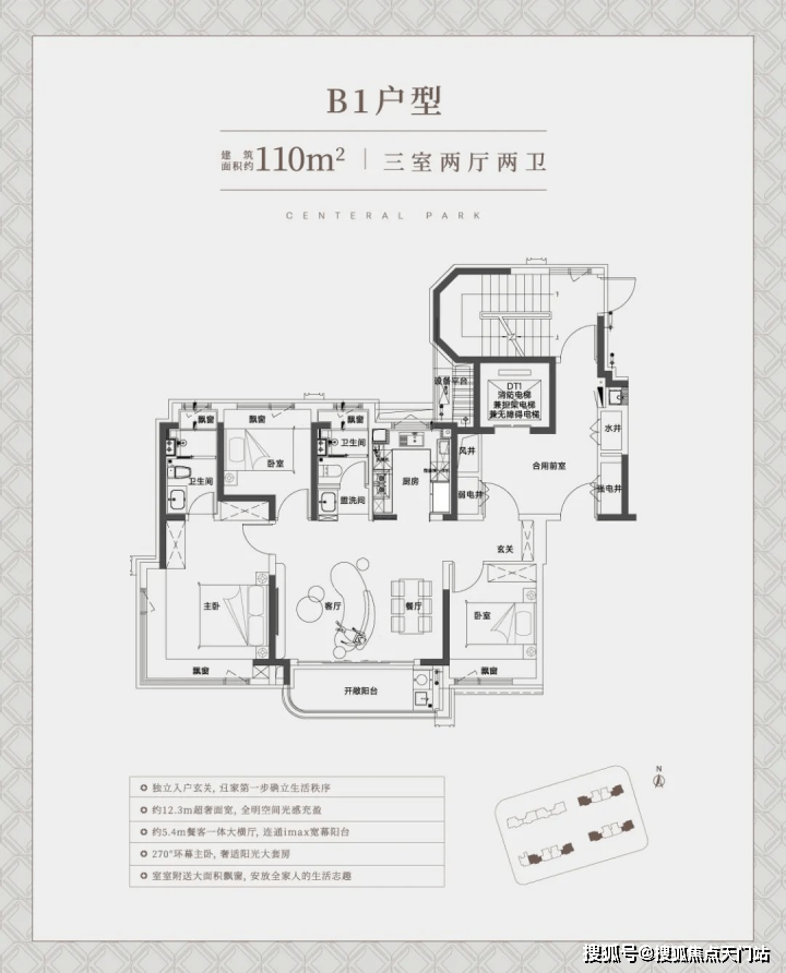 建面约110㎡中间套竖厅户型,同样也是标准的南北通透飞机户型,整体室内的采光、尺度感、通风都相当出色。非常适合一家三口、年轻夫妻的全生命周期需求!