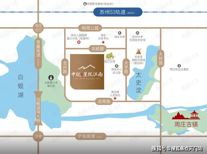(S3 规划)项目北侧还有一条规划中的轻轨 S3 号线,东连上海 17 号线漕盈路站,西接苏州 4 号线同里站,途径淀山湖、锦溪、周庄,此线路一旦通车将极大地加速整个南部水乡旅游业的发展;轻轨的开通将会给南部水乡的生活方式带来质的飞跃,当然也会让您今后的出行变得非常便利。