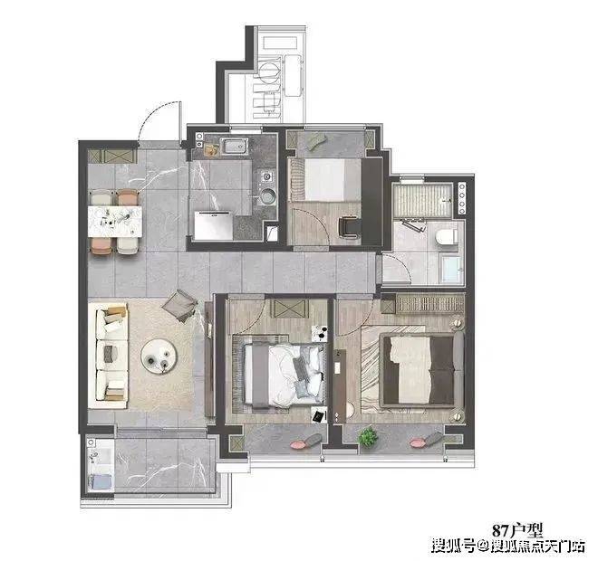 建面约99㎡的三房设计,在空间上使用功能更加多样化,一站式解决了家庭生活的所有功能,优化居家动线,大大提升空间的居住体验。