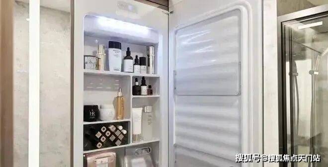 卫浴空间同样精彩,采用高仪的台盆、龙头、智能马桶、淋浴花洒等,主卫创新定制“美妆冰箱”,满足业主对美妆、护肤用品冷藏的需求,足见开发商对成本的舍得。