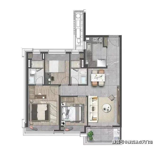 该户型贴合当代人居生活习惯,既适合三口之家小太阳家庭,也可以是三代同堂,每个人都能拥有独立空间。