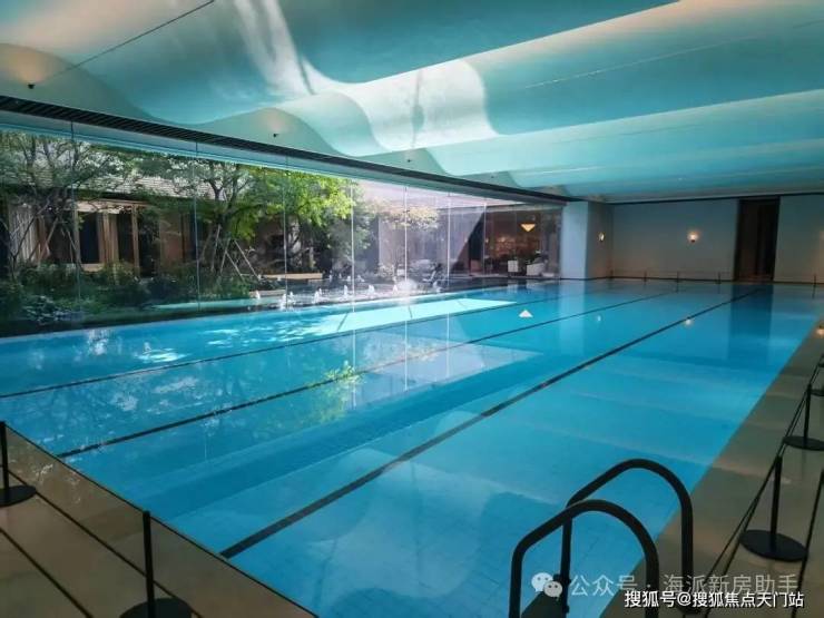 最后来看泳池。云邸玖章做了再升级。改为采用大尺度的落地玻璃拼接,约2.4米宽巨幅玻璃,且通过精致的玻璃交接细节处理增进室内外空间的融合,强调泳池的无界感,真正实现了无边泳池的效果、质的飞跃。
