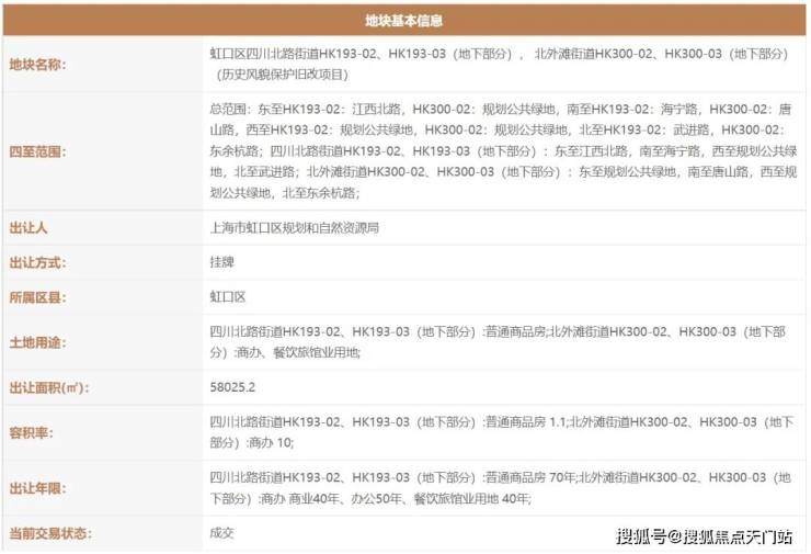 2021年2月,上海虹口城市更新建设发展有限公司(上海地产联合体)以111.35亿拿下了虹口区四川北路街道HK193-02(17街坊弘安里)、HK193-03(地下部分);北外滩街道HK300-02、HK300-03(地下部分)(历史风貌保护旧改项目)。