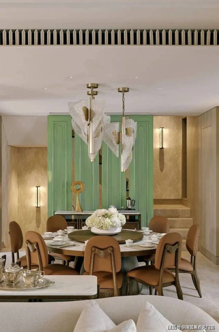 顶层下午茶区以淡绿为底,壁炉暖光漫过手绘地毯的肌理,将社交场域沉淀为冥想容器;主人房墙面缟玛瑙(Onyx)的天然流痕,也与一层屏风暗纹形成时空对位,光影在矿物晶体中生长出私密的诗。