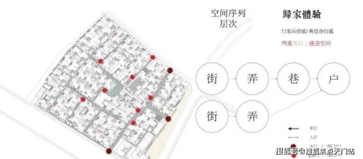 士林润园别墅规划可分为蓬莱路城市公共景观以及社区内部景观两个部分,其中市政绿地衔接于上海2035城市总体规划中“蓝绿丝带”的上位条件要求,社区内部街巷空间形成空间序列形成递进的层次,将归家体验的序列依次展开,形成城市街道→入口(一级门户)→街巷→节点空间→里弄门(二级门户)→合院入户(三级门户)的方式,基本可保证大多数住户可体验到两重以上的空间递进。