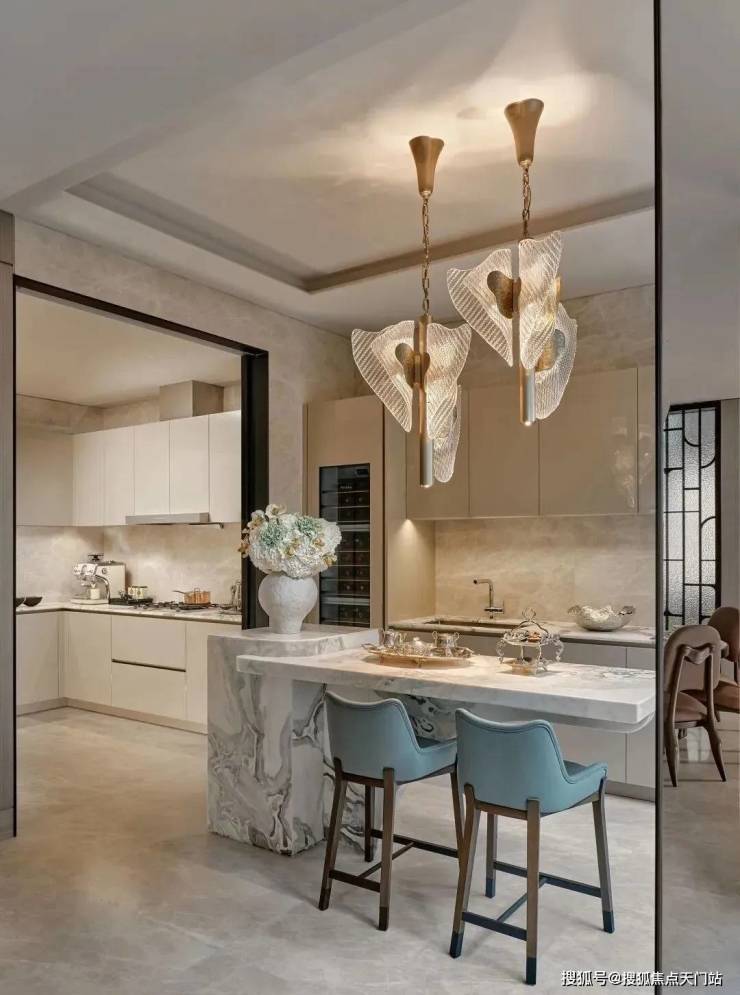 主厅核心区悬浮式定制柜体,银箔与丝绸在几何切割中构建中式基因,毕加索石材的天然裂变肌理成为天然艺术装置。瀑布吊灯以流体力学演绎东方留白,让光影在岩板表面生长出动态水墨意境。