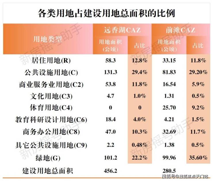 有趣的是,远香湖CAZ在规划功能分布上的开发强度与前滩开发占比十分相似,甚至总体开发建设用地面积相当于前滩的约1.5倍。