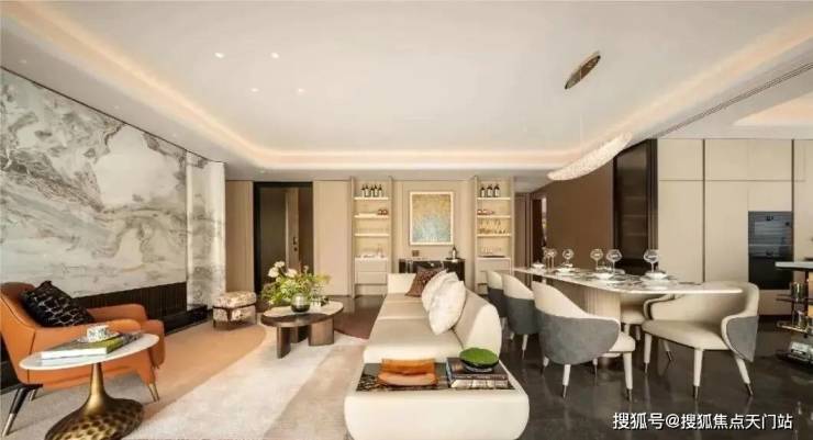 客厅背景墙选用的 意大利阿普那奢石,经过无数次打磨才选定,为的是追求“一眼万年”的永恒美感