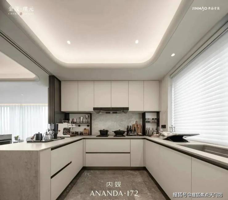 厨房是更实用的U型布局,搭配一个独立的中央岛台,形成家庭的 第二互动中心,孩子写作业、朋友来喝杯咖啡,都能在这里进行