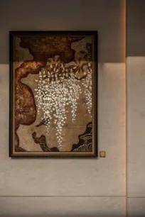 此外,招商序更堪称一座手作慢艺的殿堂,许多珍贵的非遗绝技于此重获新生。从入户大堂巨幅火烧金箔艺术画作、秸秆镶嵌精妙入微的艺术装置、到源于西周的螺钿工艺的流光溢彩,每一个艺术品与画作都有着在地文化的故事,通常只能在内环豪宅中方可见到如此之多的手工艺术品。