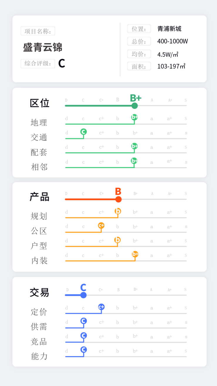 先看区位评级B+,其中地理b+,交通c,配套b+,相邻b+。