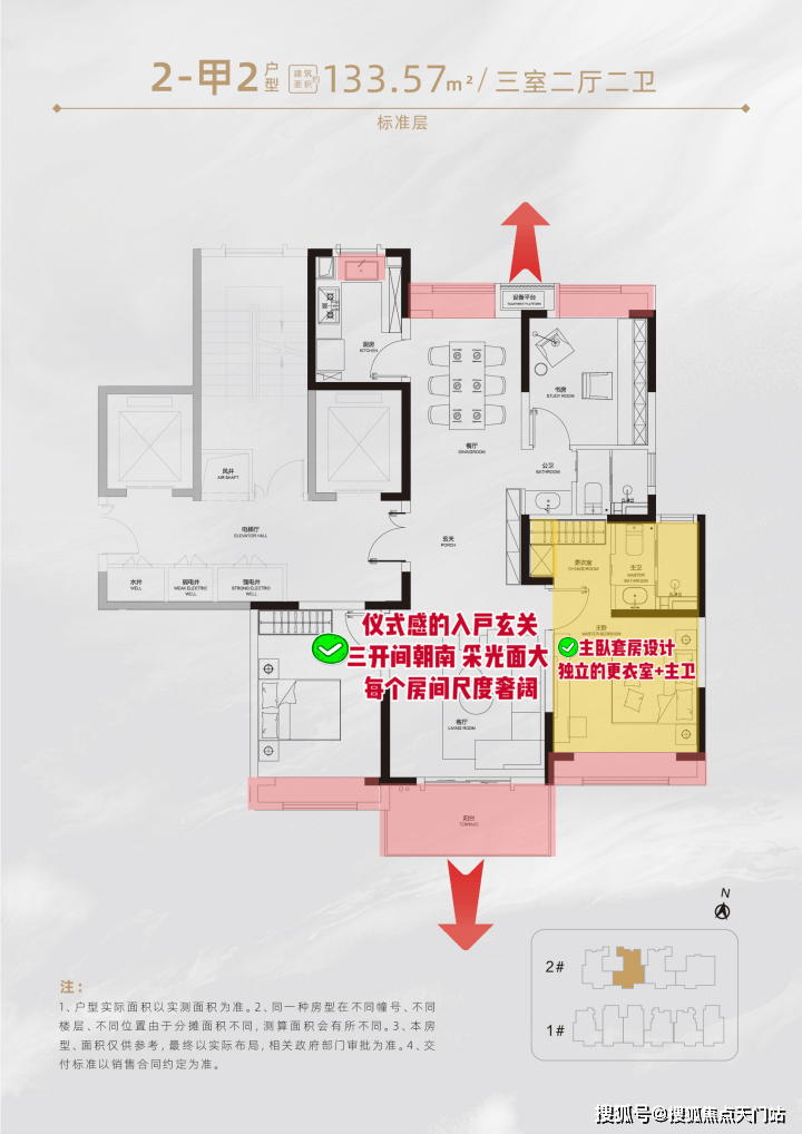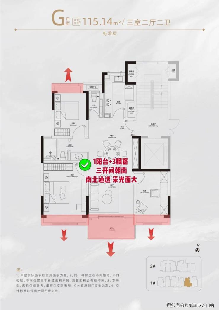 户型设计上,一阳台+多飘窗,南北通透的全明设计,实打实省出许多使用面积,得房率高达约76~80%!无论是年轻小夫妻还是三代同堂,都拥有奢阔的居住尺度。