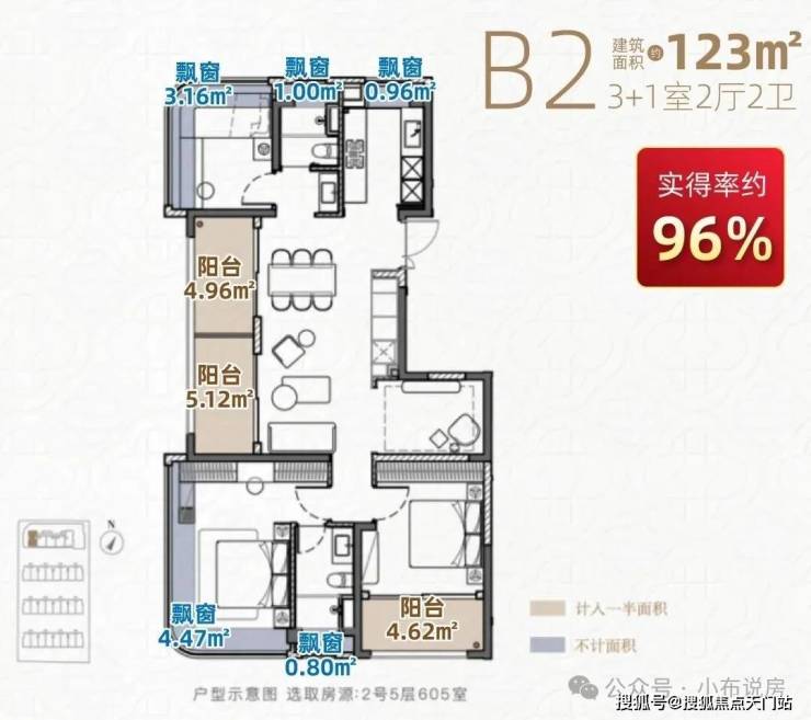 3阳台+5飘窗,合计赠送面积约17.7㎡,实得率更是惊人地达到了约96%(2号楼05室) 。