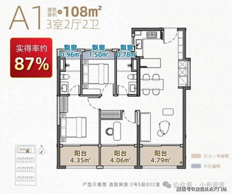 3阳台+3飘窗,合计赠送面积约10㎡,实得率约87%。