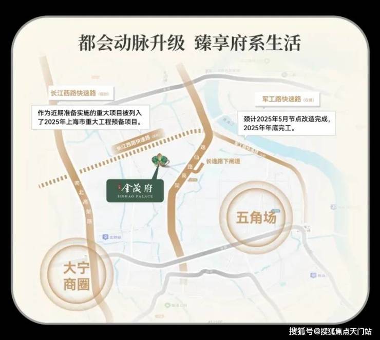在城市交通路网方面,江湾金茂府同样优势显著。周边拥享中环高架、长江西路快速路、外环高速三横主轴,以及逸仙路高架、南北高架两纵接驳 。