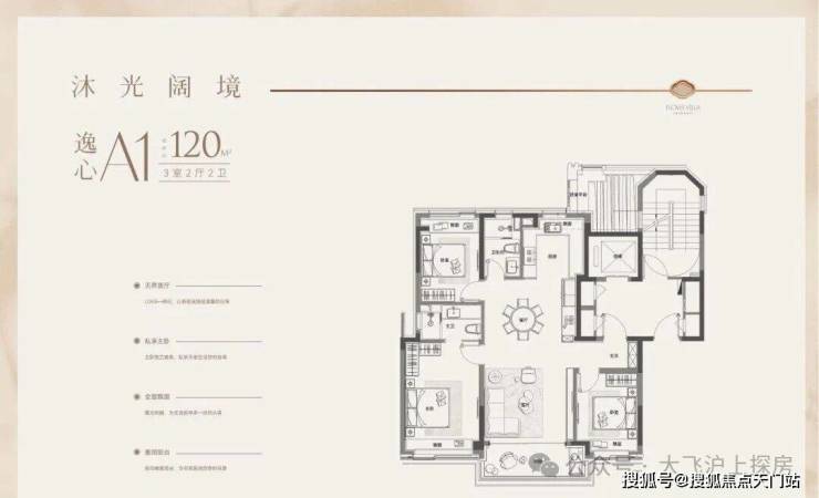 户型特点:边套户型,3开间朝南,方正格局。客餐厅一体化设计,餐厅空间宽敞,客厅进深较短但可通过与阳台连通优化空间感。全屋飘窗设计,边套南北卧室为270°转角飘窗,采光充足。独立电梯厅约7-8㎡,可改造为玄关或收纳空间。
