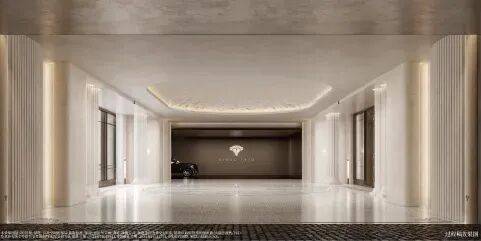 预接待厅地面瓷砖采用威尼斯白与爵士白石材拼花设计,纯人工铺装保证花纹的奢华质感。