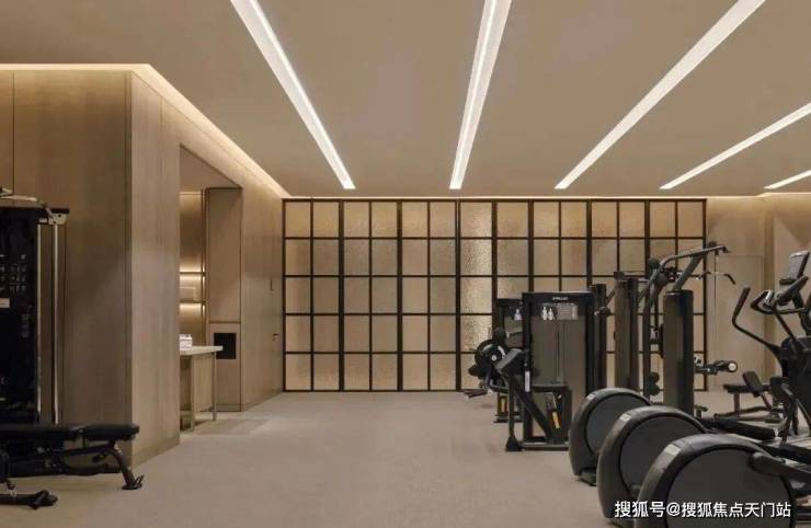 健身房的设计也同样充满了细节。黑框玻璃门的复古韵味,和现代健身空间的功能性做到了完美结合。