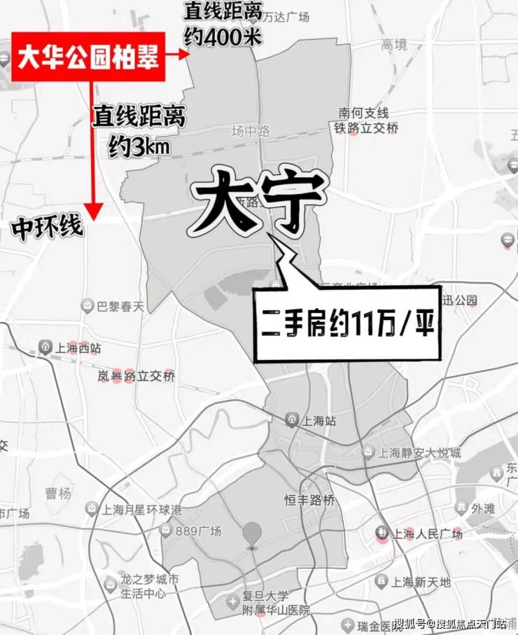 如此一来,同纬度的大华·公园柏翠成了难得一觅的存在!它的地段有多好——直线距离静安区只有400米,距离中环线3km!