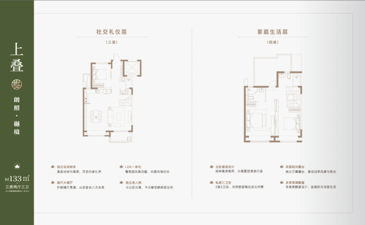 有更大尺度的改善需求可以选择项目的叠墅。叠墅产品分为4F、6F层叠加, 主力产品建面约约122-133㎡上叠,132㎡大平层,131-145㎡下叠。